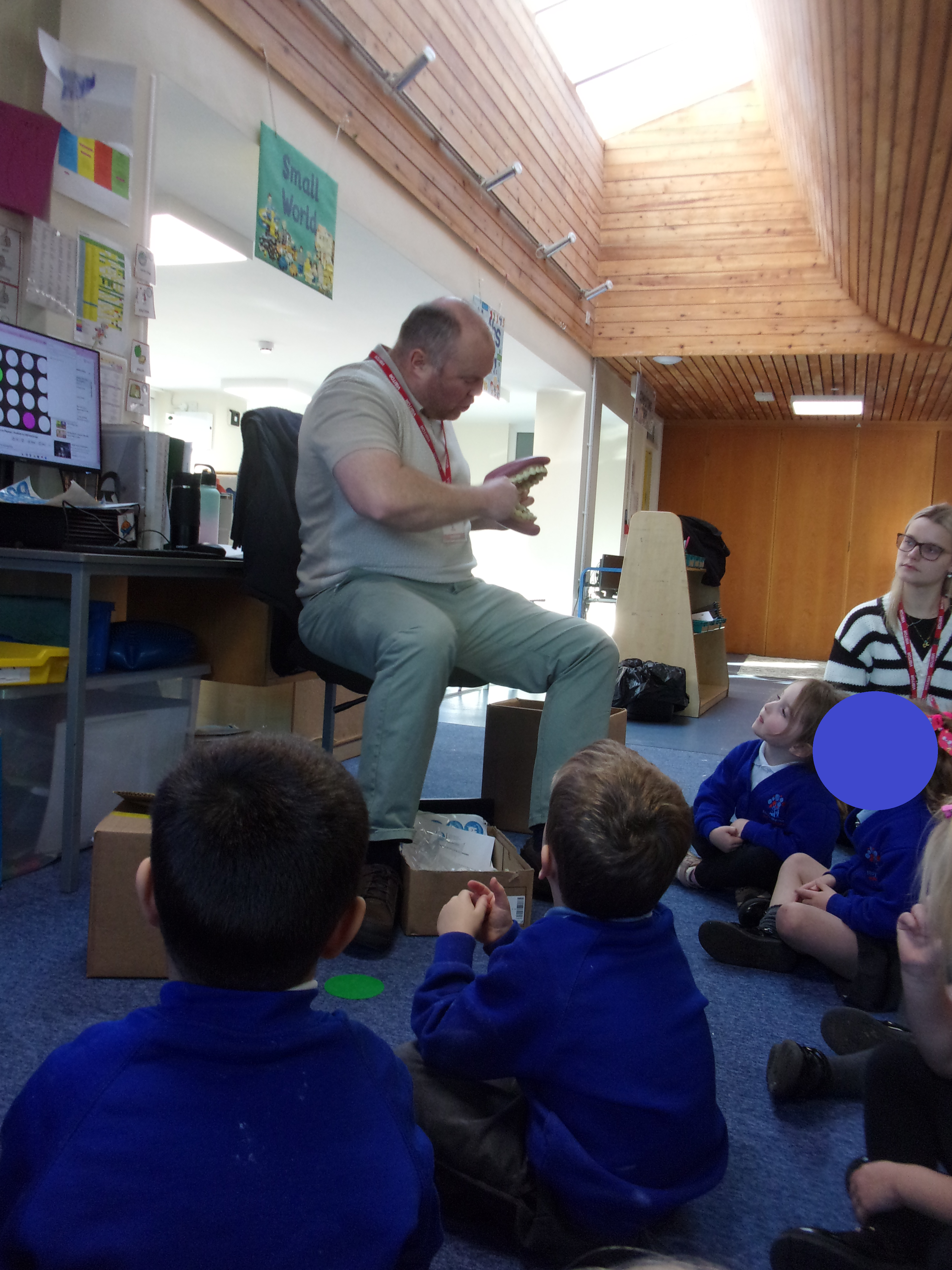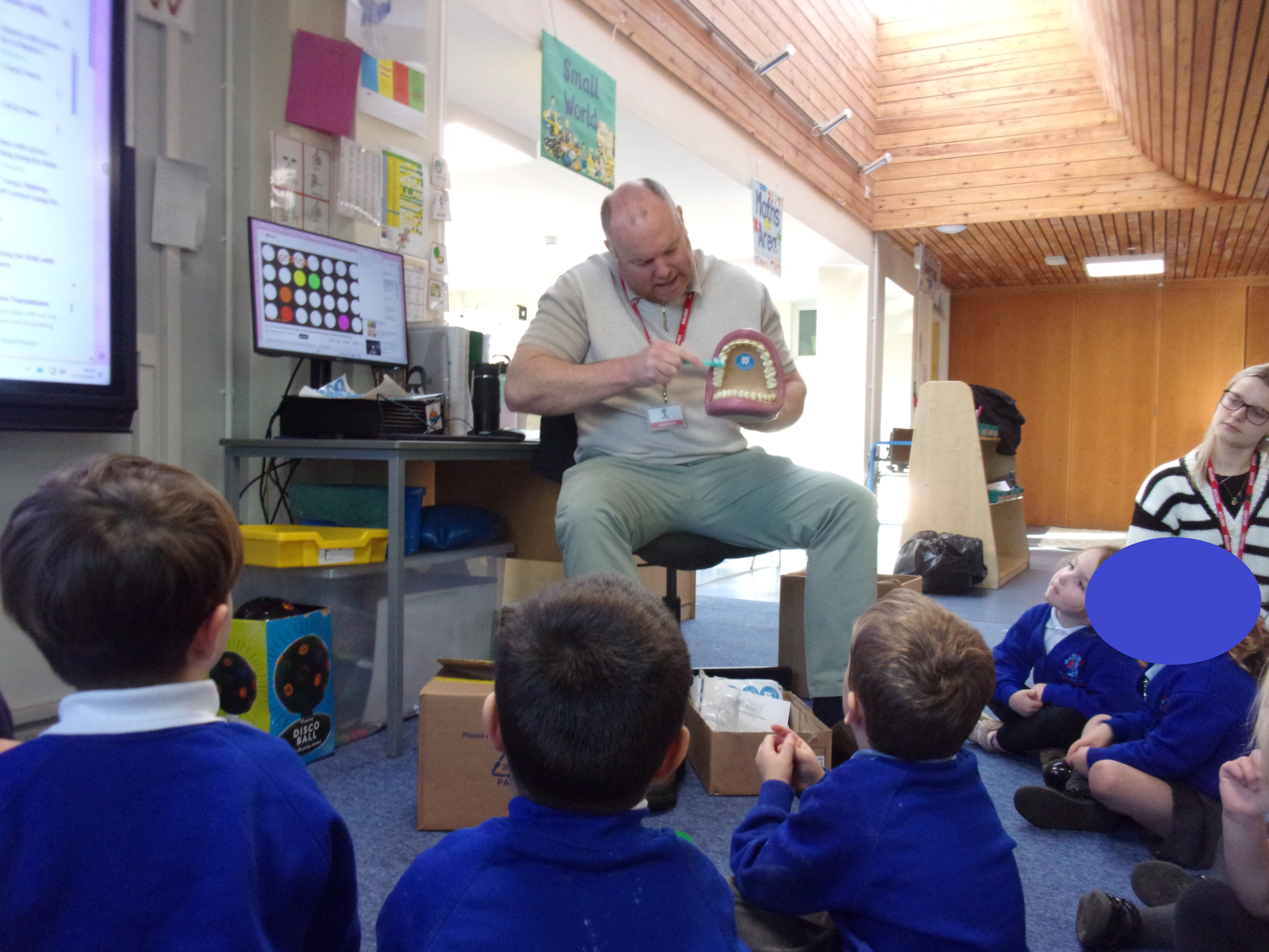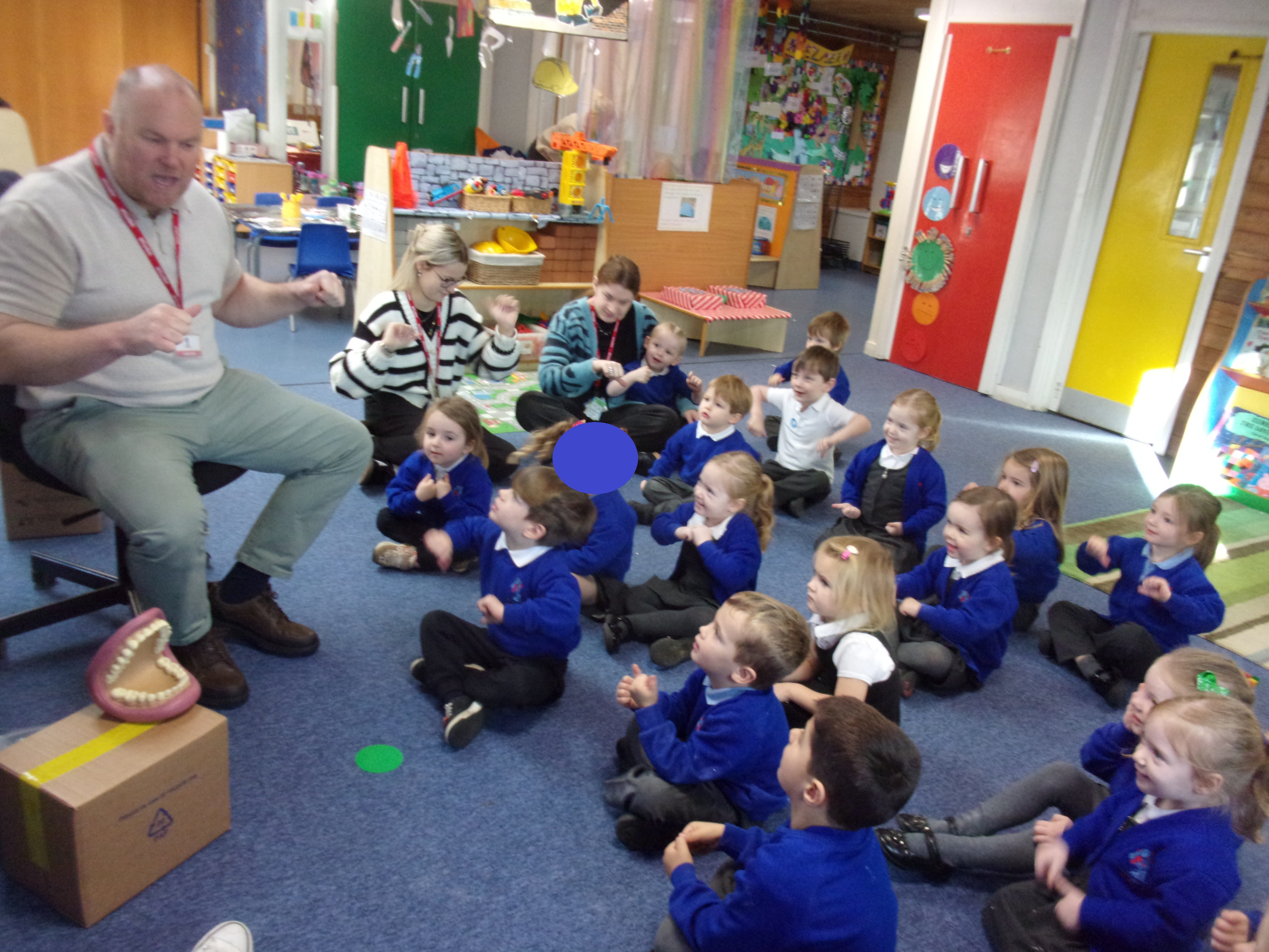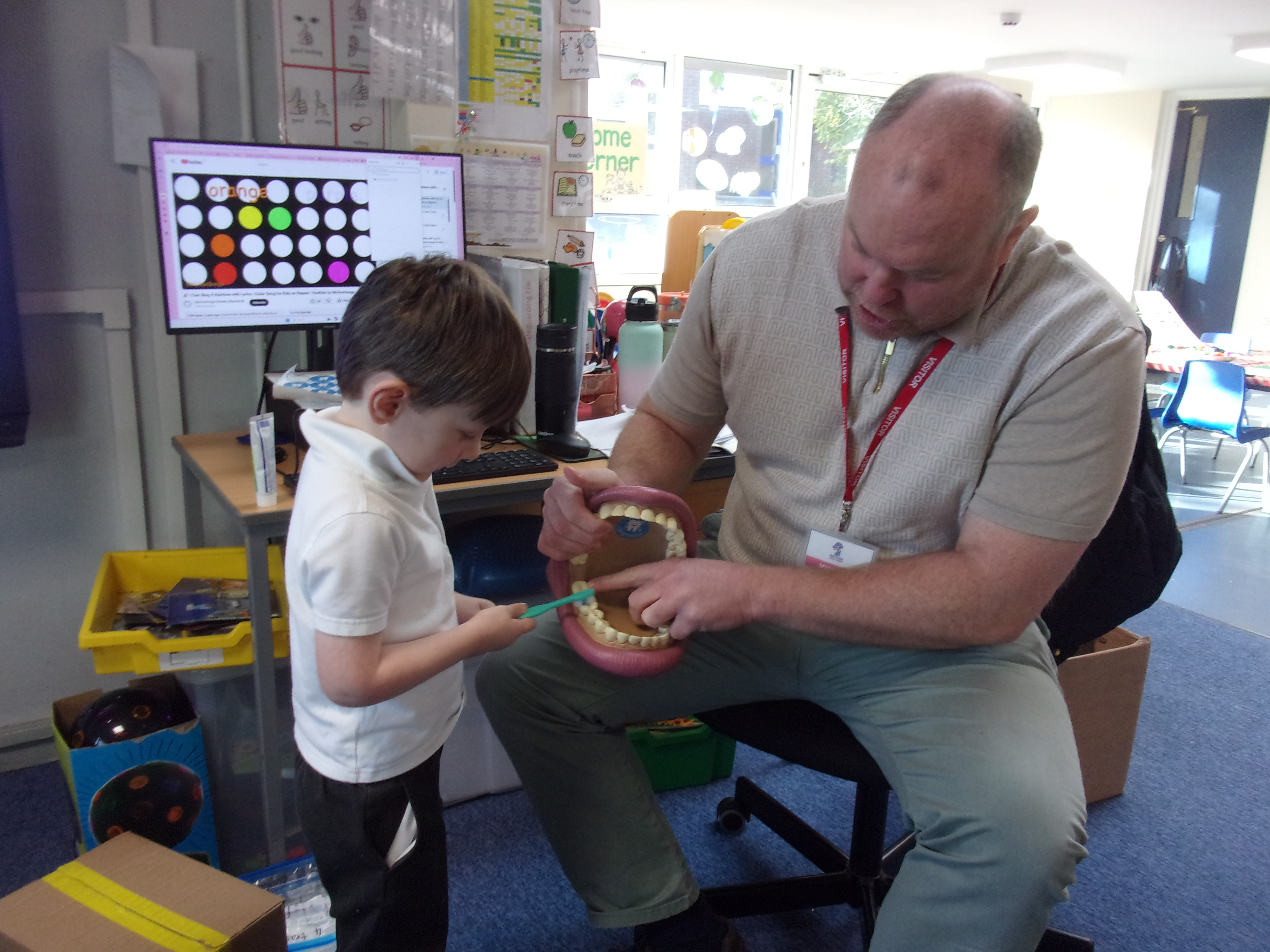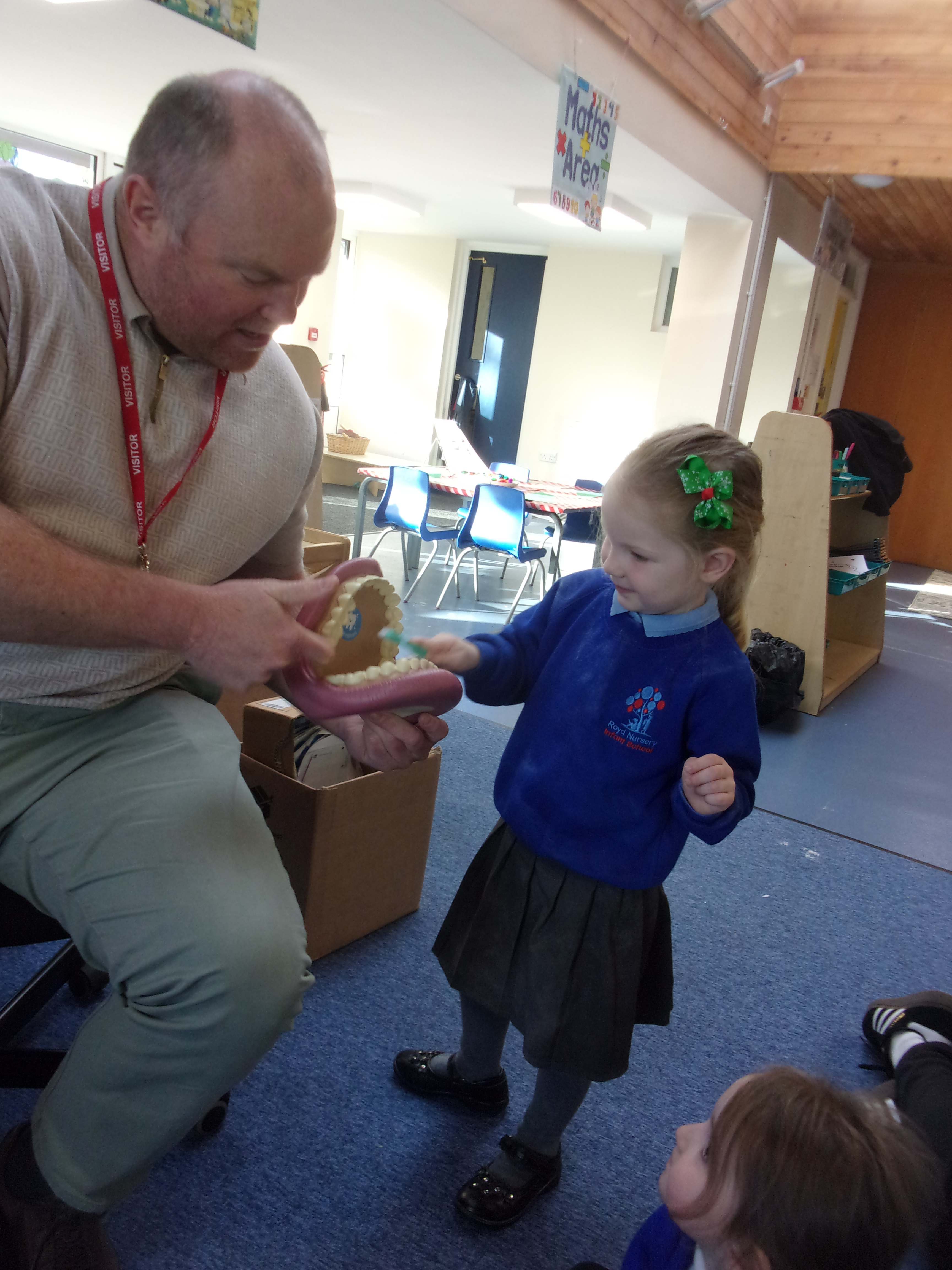 We recently invited a local dentist in to visit our setting. He spoke to our children about getting into good oral routines and was able to show the children how to brush their teeth properly using his giant pretend mouth and toothbrush. He also spoke to the children about how often and for how long we should brush our teeth and about foods that are good or bad for our teeth. All the children enjoyed having our visitor and were each able to take home a tube of toothpaste and toothbrush so that they could get practising.