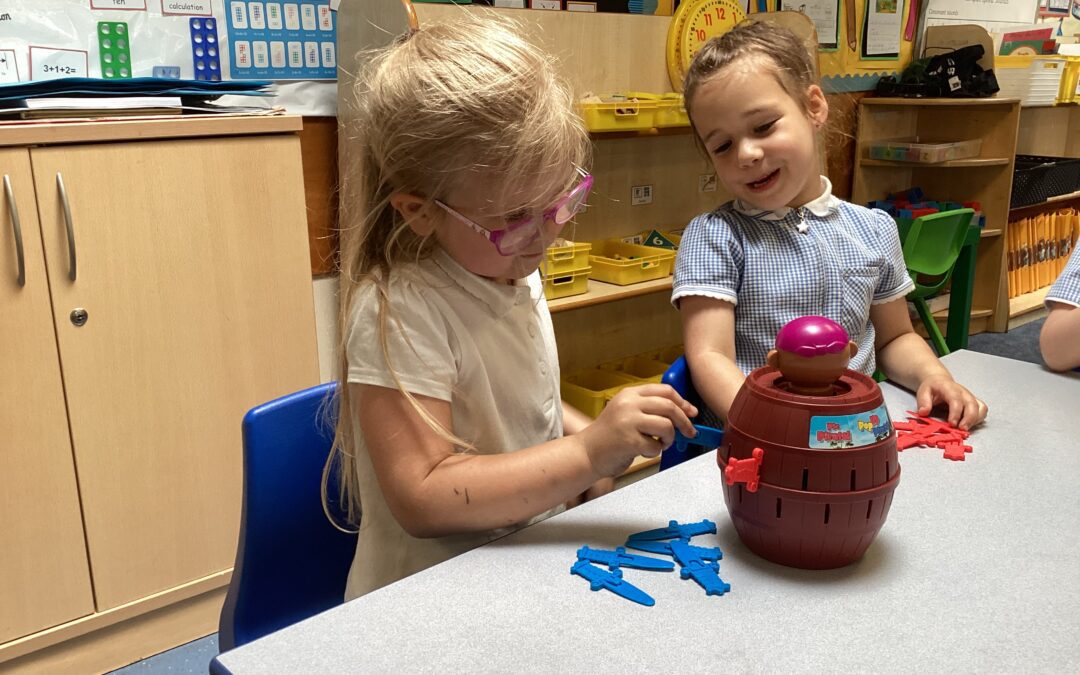 During our ‘which is the biggest dinosaur?’ topic, the children have been learning all about dinosaurs! We have been naming them and describing them using vocabulary such as gigantic, sharp and rough scales. We have enjoyed using duplo blocks to print scales onto dinosaurs. We have been writing descriptive sentences about dinosaurs too. In maths, we have practised using dinosaur footprints to order numbers forwards and backwards. This half-term, we have also been playing lots of team building and turn-taking games such as Jenga and Pop-Up Pirate.